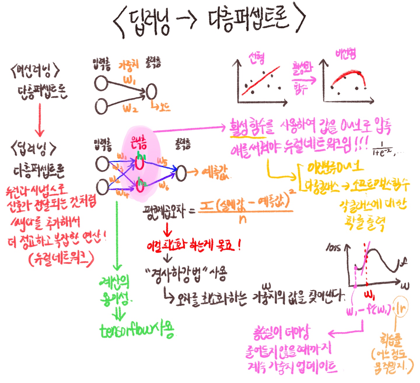 정리하자면, '은닉층'이라는 layer를 추가한 '다층 퍼셉트론'에서, 활성화 함수를 사용한 '딥러닝 알고리즘'은, 예측값과 실제값과의 오차를 최소화하기 위해 여러 방법을 사용한다. 이때 다양한 수학적 원리가 사용되며, 계산의 용이성을 위해 tensorflow 라이브러리를 사용한다. 활성화 함수는 이진분류를 할지, 다항분류를 할지에 따라 다른 함수를 사용하며, 데이터 및 결과를 살펴보며 다른 함수를 적용하여 사용하는 것이 더 유리할 수 있다.
