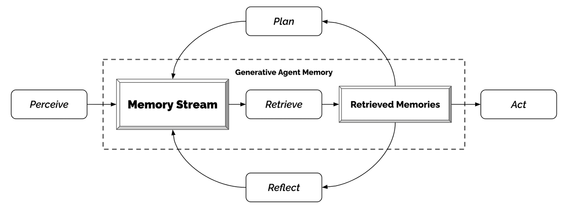 - 구성 요소: 기억(Memory), 반성(Reflection), 계획(Planning).