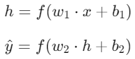 예를 들어, 입력 xx가 은닉층을 통과해 h가 되고, h가 출력층에서 최종 출력 y^\hat{y}로 변환된다. 수학적으로는 다음과 같다.
