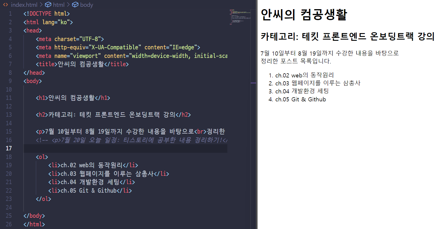 - 아래와 같이 작성하면 각각의 list에 순서 번호가 매겨진 채 브라우저에 표시된다. ( 1. ch.02 web의 동작원리 2. ...)